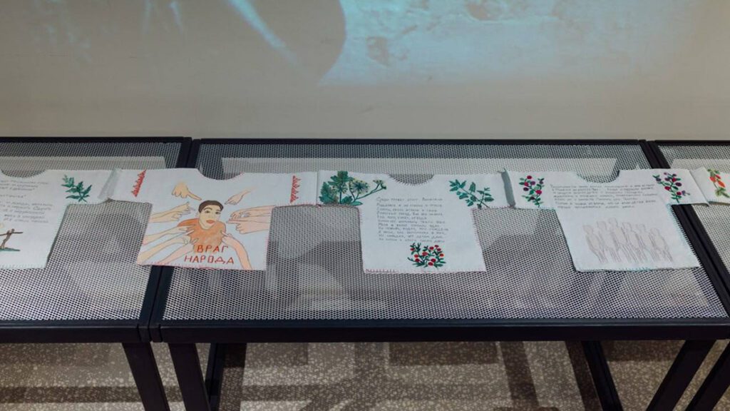 Анну Бакшаеву принять участие в выставке попросила Лукия Мурина. Ее работы — текстильная книга, видео и живописный полиптих. Сама Анна не знает, были у нее в семье репрессированные, никто в семье ничего не рассказывал, а сама художница пока в архивах ничего не искала. Анна начала для работы над выставкой читать истории, опубликованные на сайте музея. И ее зацепили именно дети, пережившие ссылку вместе с родителями.