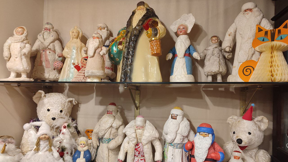 Перед Новым Годом в экспозицию добавили новогодние атрибуты — советских Дедов Морозов и Снегурочек. Один из них — москвич конца 50-х. Есть и «провинциалы»: из Калинина (Твери) и Воронежа. Снегурочки родом из Киева. Жестяные банки с рисунками ракет — в них детям дарили сладкие подарки на Кремлевской елке начала 60-х. Атмосферу дополняет огромная елка со стеклянными советскими игрушками и новогодними гирляндами из СССР. А также раритетный патефон 1935 года.