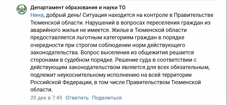 «Нарушений в вопросах переселения граждан из аварийного жилья не имеется. Жилье в Тюменской области предоставляется льготным категориям граждан в порядке очередности при строгом соблюдении норм действующего законодательства». Ведомство упомянуло и про суды, в которых сейчас решается вопрос выселения. «Решение суда в соответствии с действующим законодательством является для всех обязательным, подлежит неукоснительному исполнению на всей территории Российской Федерации, в том числе Правительством Тюменской области», — заверили в департаменте.