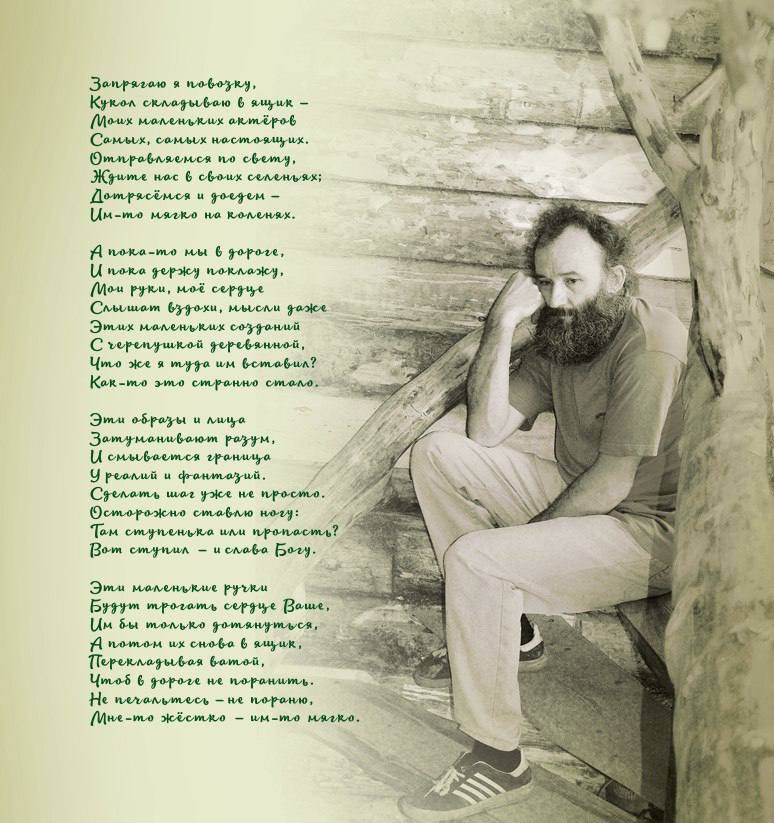 «Я работаю управляющим гостиницей. Куклы для меня — это не хобби и не дополнительный заработок. Ни в коем случае. Куклы — это способ реализации творческого начала и дань уважения Мастеру. Спектакли проходят раз в две недели в Этномире, иногда я выезжаю в Москву на гастроли, показываю по несколько спектаклей за день. Каждый раз рассказываю зрителям о Мастере, его технологиях и чудесном „2+КУ“, который после трагедии справляется со всеми невзгодами и продолжает дело».