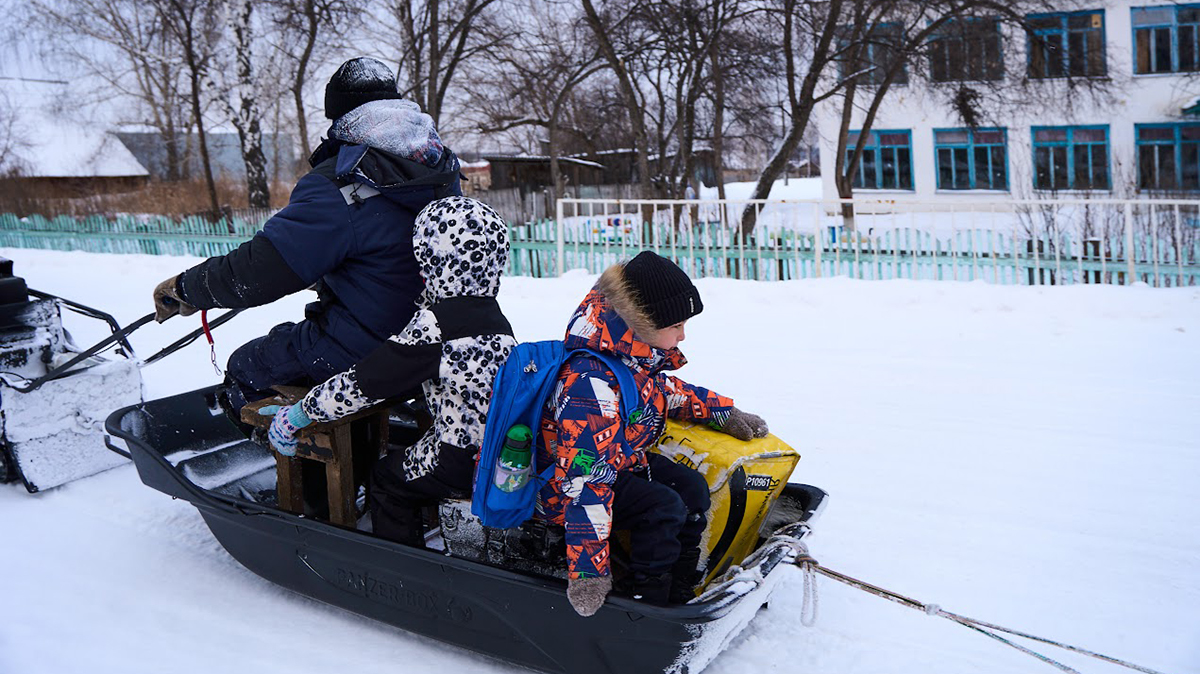 Сергей работает на вахте в другом регионе, а в свободное от смен время ездит на рыбалку на снегоходе. Улов бережно складывает в сумку курьера Яндекс.Еды, оставшуюся с прошлой работы. В его санях по селу перемещается и пойманная рыба, и местные дети