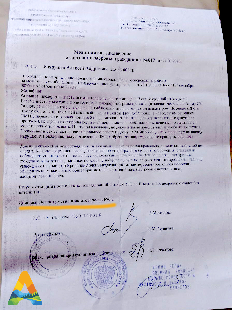 У Алексея диагностирована легкая умственная отсталость (олигофрения в легкой степени). Он пожизненно состоит на психиатрическом учете, окончил коррекционную школу по программе для детей с особенностями развития (VIII вид). Все медицинские справки есть в распоряжении редакции.