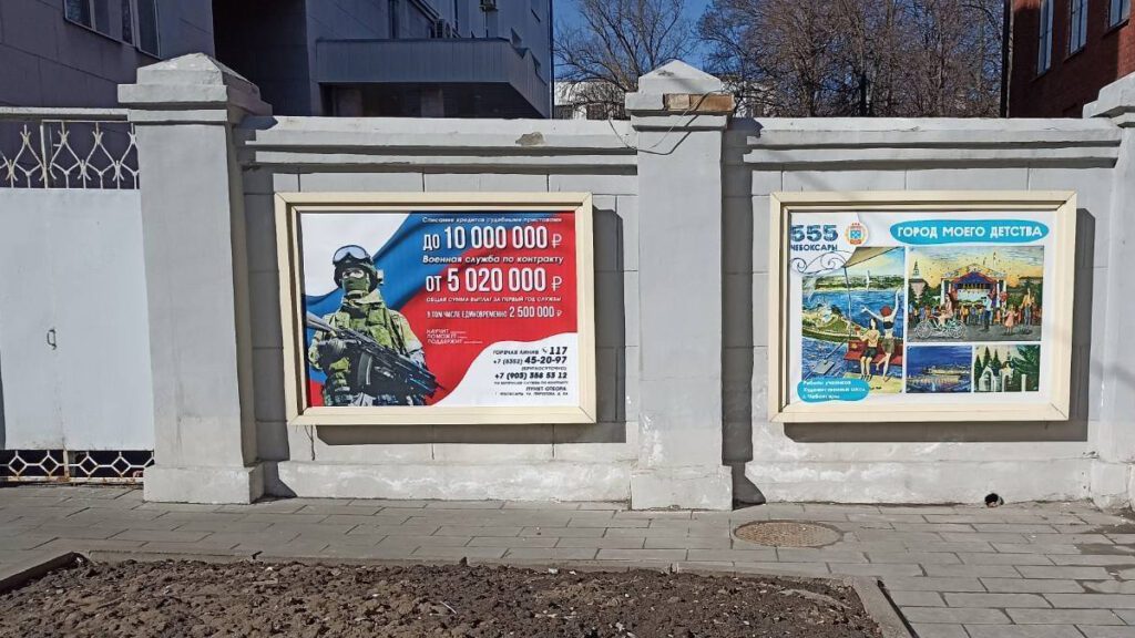 В Чебоксарах, как и во многих городах России, на остановках и домах размещены плакаты с рекламой военной службы по контракту. С 1 ноября 2024 года в Чувашии увеличили региональную выплату: сейчас ее размер составляет миллион рублей. Вместе с выплатой от Минобороны контрактник получает полтора миллиона. Большие деньги по местным меркам — средняя зарплата в Чувашии в 2024 по данным Росстата около 60 тысяч рублей. Независимое медиа «Сердитая Чувашия» установило имена 1040 граждан Чувашской Республики, погибших на войне с Украиной, на начало апреля 2025 года.