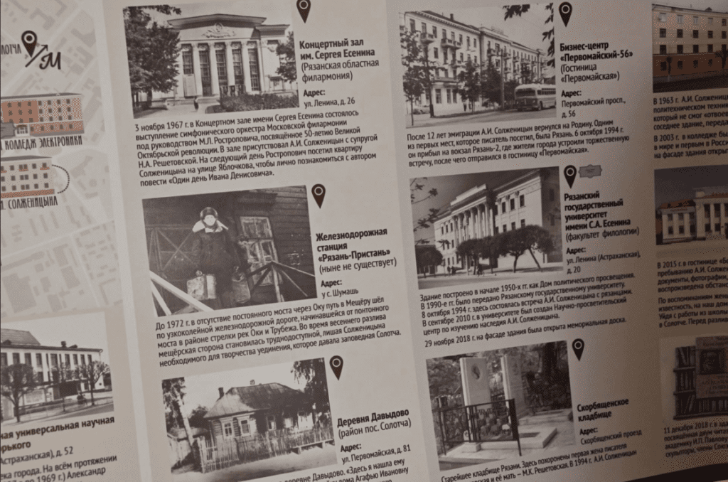 — Эта карта-схема — очередная среди путеводителей по местам, связанным с жизнью Есенина и Салтыкова-Щедрина, Циолковского и Паустовского. Да, отношение к нему двоякое, но мы сейчас говорим о нем как о писателе и ярком человеке, оставившем след в Рязани, и во всей России. В путеводителе информация о Солженицыне и о зданиях, с которыми связана его жизнь и творчество. То есть также рассказываем и об исторических строениях, — пояснил краевед.