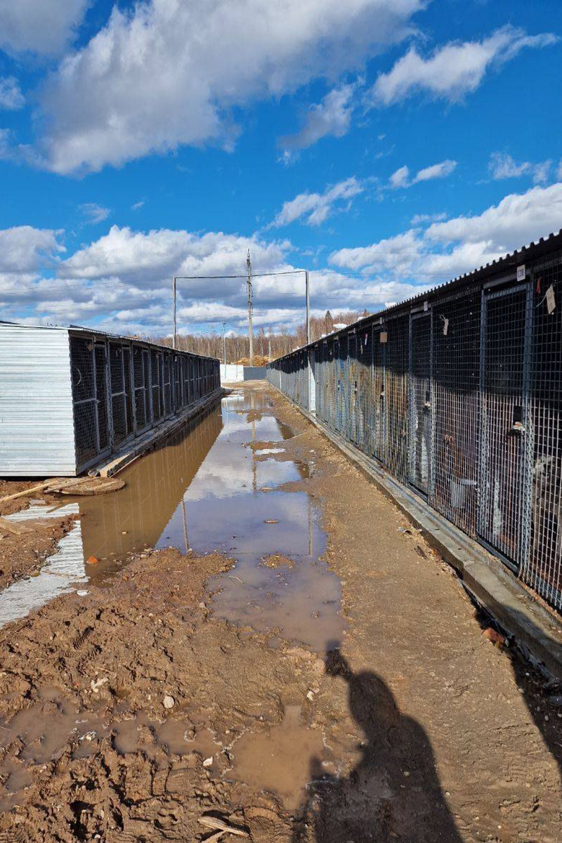 Объекты приюта расположены очень далеко друг от друга, что неудобно для работы сотрудников и волонтёров. Вода не подведена к вольерам. Зимой люди носили её лейками из туалета ветприёмника. Весной всё затопило. Нормальной дренажной системы нет, и лужи стоят постоянно. Крыши над вольерами не оборудованы жёлобами, и вода льётся с них на рабочих и волонтёров. Тонны сухих кормов и солома мокнут в амбаре, – говорит Ольга.