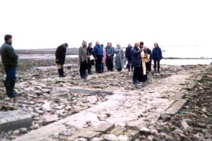 Мологжане служат молебен в Мологе во время экспедиции 1999 года. / Надгробия, оставшиеся на месте мологского кладбища к 2014 году. Фото: Музей Мологского края