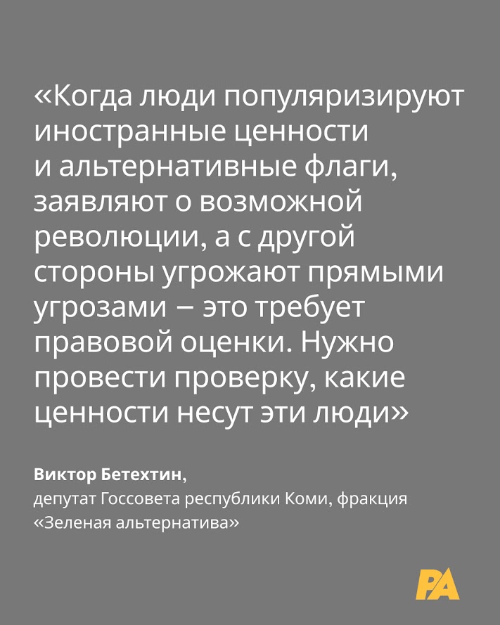 — Этот флаг — народный символ, он был в свое время создан активистами в Коми и получил широкое распространение. И по большому счету утверждения о том, что он является символом сепаратизма или еще чего-то подобного — это выдумки самих авторов этого доноса.