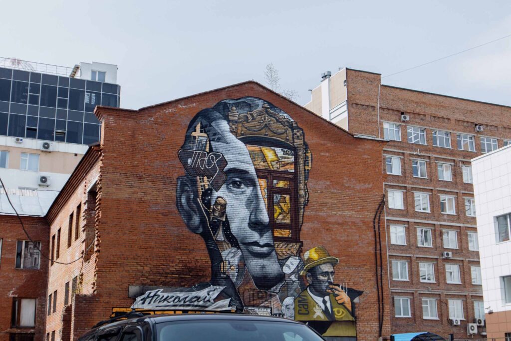 У Томского ТЮЗа — мурал-микс с портретом поэта и драматурга Николая Эрдмана, которого в 1930-х годах сослали в Томск. В городе он прожил всего полтора года, но, несмотря на это, успел запомниться жителям своей инсценировкой романа Максима Горького «Мать».
