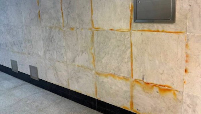 3 января пассажиры петербургского метро обнаружили следы ржавчины на стыках мраморных плит в переходе между «Кировским заводом» и новой станцией «Путиловская».