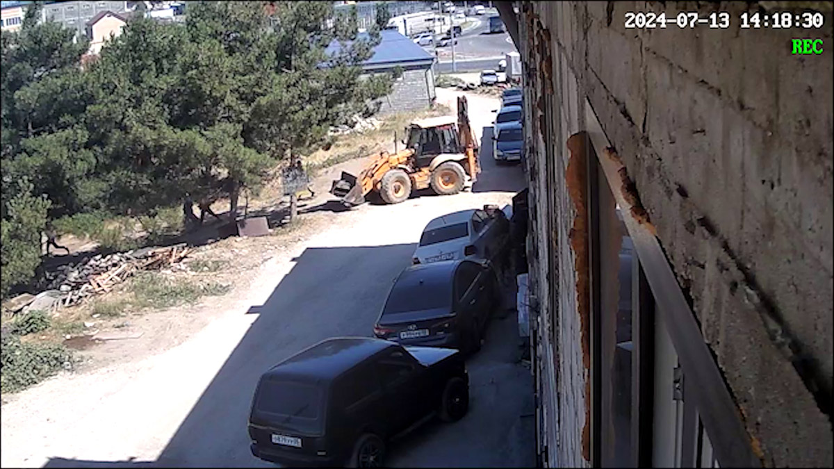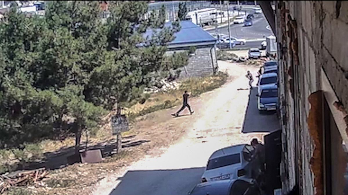 Дом на окраине Махачкалы, неподалеку от южного автовокзала. Камера наружного наблюдения показывает часть пустыря, заросшего редкими елками. На переднем плане копошится трактор, на заднем видна развязка у выезда из города. На счетчике времени — 14 часов 18 минут 13 июля 2024 года. Со стороны развязки подъезжает черная Лада. Из нее выходит человек в красной рубашке с карабином в руке. Он бежит вглубь пустыря и скрывается за границей видимости камеры. Тут же подъезжает вторая машина. Теперь уже пять человек идут вслед за первым. Один передает другому предмет, похожий на пистолет. Они переходят на бег, следом торопится одинокий мужчина в белой рубашке. Все семеро уходят из зоны видимости.